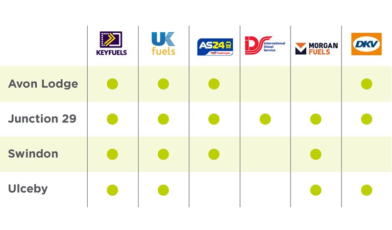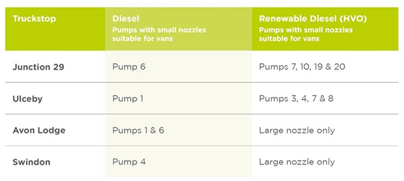 The table below shows which pumps are suitable for van drivers, which offer diesel and which offer Renewable Diesel (HVO).