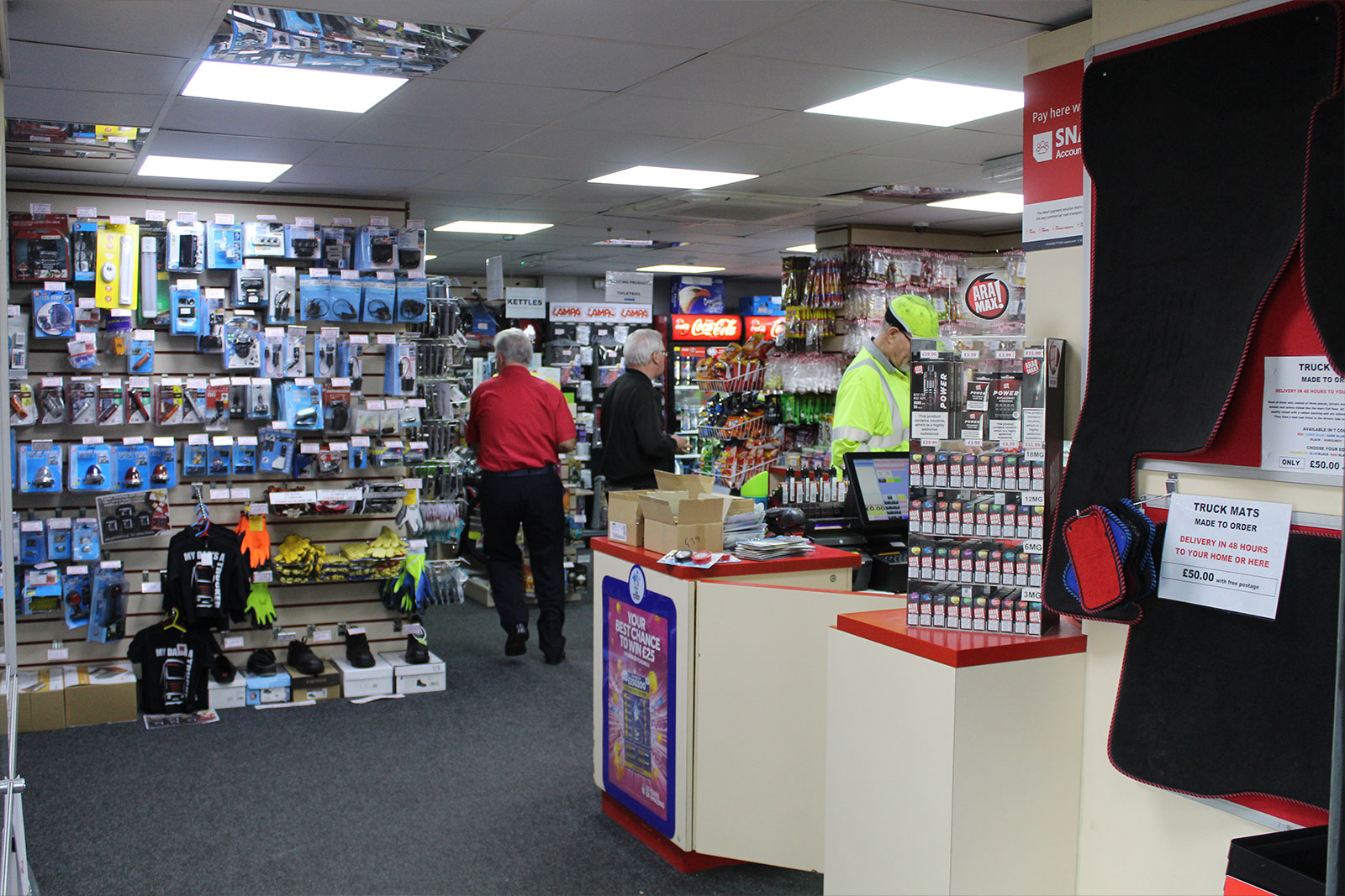 From Sat Navs and cool boxes to snacks , drinks and confectionery - we stock a comprehensive range of products and truck accessories in our on site shops.